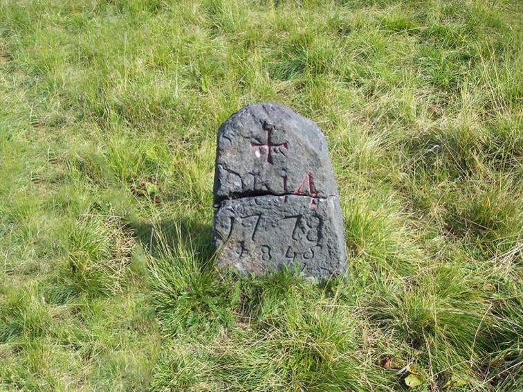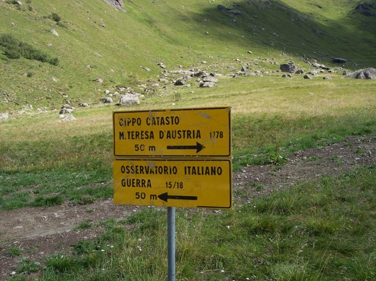Un cartello arrugginito segnala la presenza sulla destra del cippo confinario austriaco risalente al 1778 (un analogo cippo è visibile più in basso, sulle sponde del laghetto del Fedaia, nascosto dalla vegetazione): lungo questa linea passava il confine tra Italia ed Austria.
