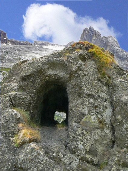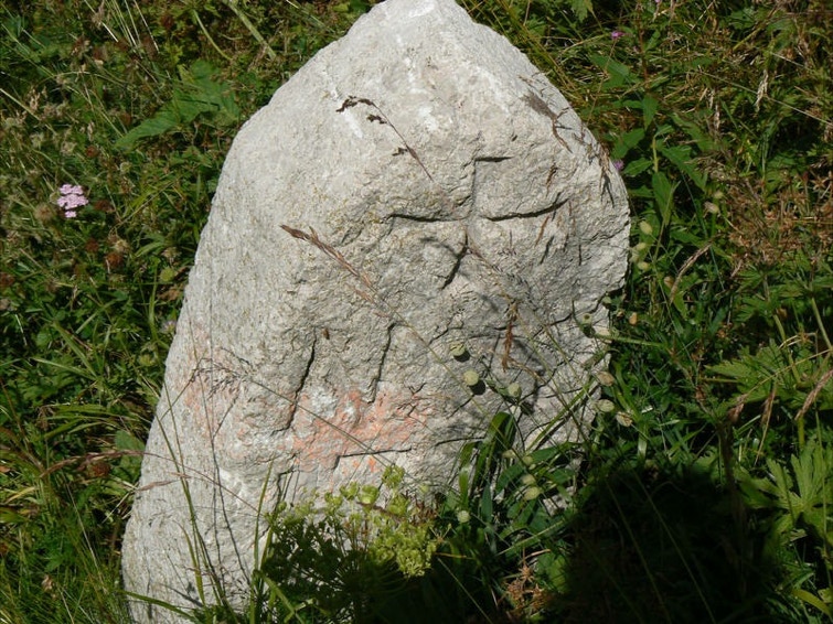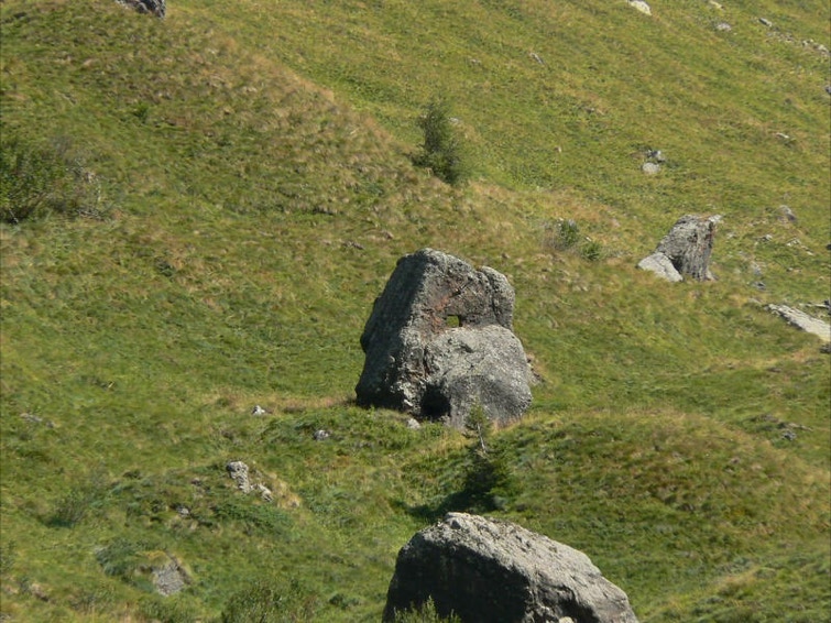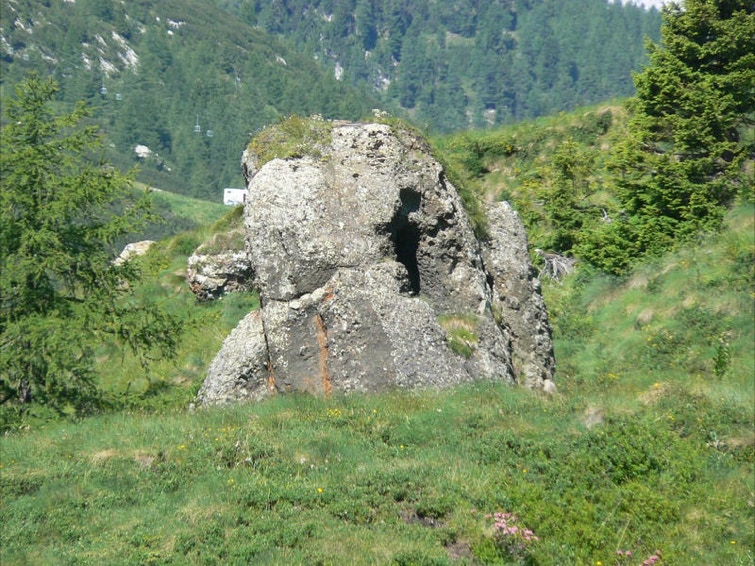 Si procede nell’erba alta per tracce di sentiero e si raggiunge un masso basaltico dalla forma squadrata, nel quale era stato ricavato l’osservatorio con vista sul passo sottostante e sul versante sud della Marmolada.