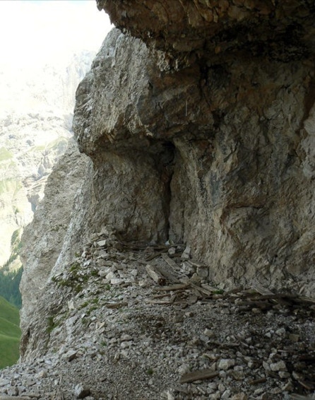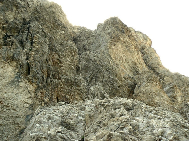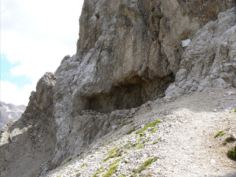 Accanto ad un’ampio basamento di baracca si trova l’attacco della difficile “Via ferrata dei Kaiserjäger” che ricalca il sentiero attrezzato di accesso alla vetta accanto a resti di scalette, fittoni e tratti del cavo metallico, muta e rara testimonianza delle tecniche della guerra in alta montagna.