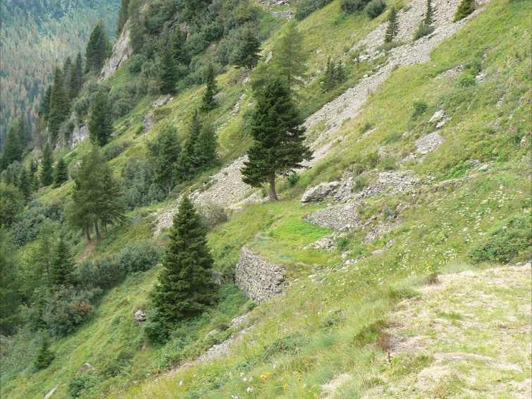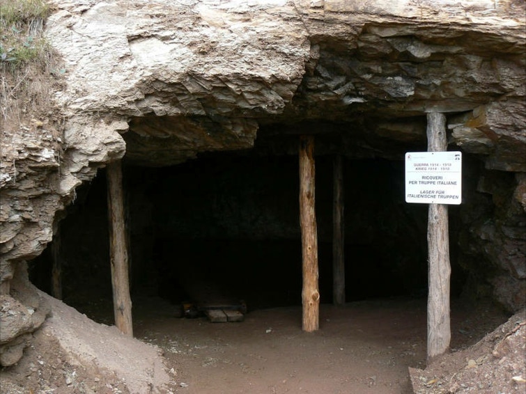 Il rientro al Passo San Pellegrino avviene attraverso la mulattiera italiana del Sas dal Musc che assicurava i rifornimenti alla prima linea; prima dell’arrivo al Passo si costeggiano alcune caverne ricovero/deposito