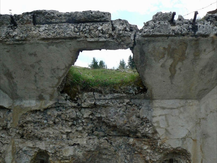 Una trincea conduce alle postazioni campali in caverna con le feritoie rivolte verso il Passo San Pellegrino. Sull’architrave di un’apertura si legge “erbaut 1917” (costruito nel 1917).