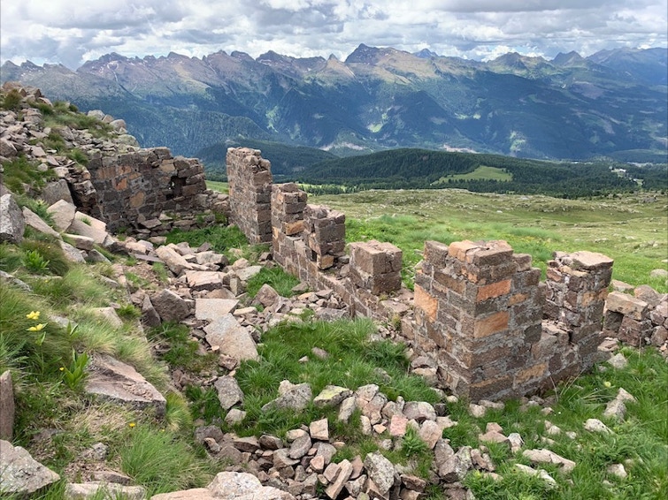 Alcune centinaia di metri più avanti a quota 2425, si possono notare i primi resti dei baraccamenti e delle postazioni in caverna rivolte verso il Gronton e Cima Bocche. In prossimità di una delle opere in cresta è stato recentemente recuperato un cippo che ricorda la 2nda Compagnia Sciatori assieme alla 4a del 39° btg. Landsturm. Queste iscrizioni sono preziose testimonianze della presenza delle truppe tedesche in questo settore del fronte.