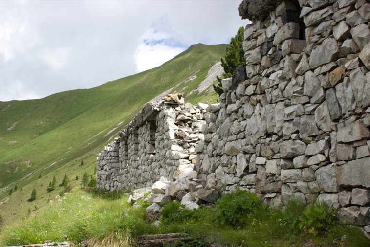 Si prosegue lungo la mulattiera che risale la china erbosa e si attraversa il Toal de Masson fino a giungere all’osservatorio che sovrasta le postazioni di difesa di Fango.
