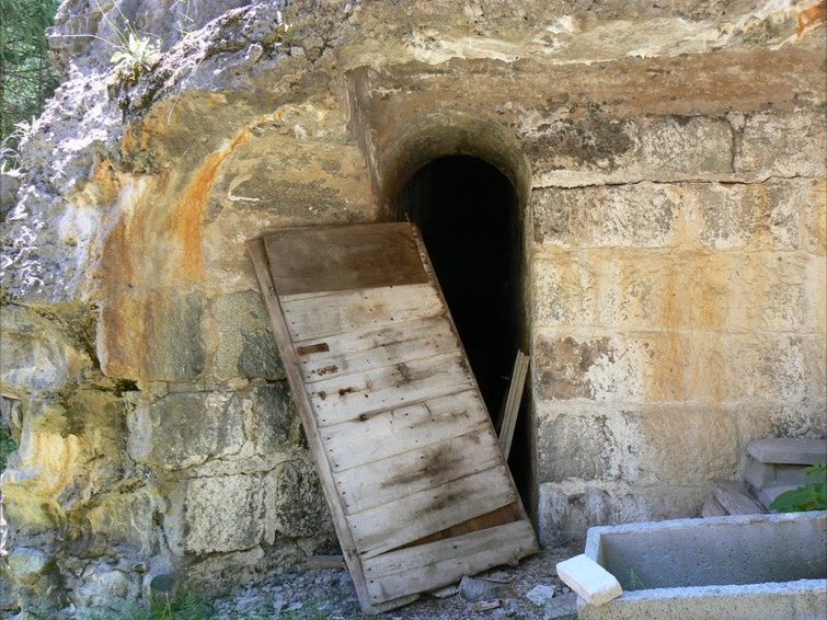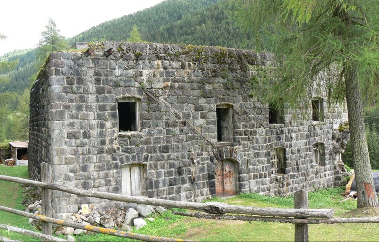 Sulla facciata rivolta verso Soméda, il portale di ingresso conserva ancora oggi la porta originale in ferro. L’interno si sviluppa su due piani con coperture formata da robuste volte a botte di calcestruzzo riccamente armato.