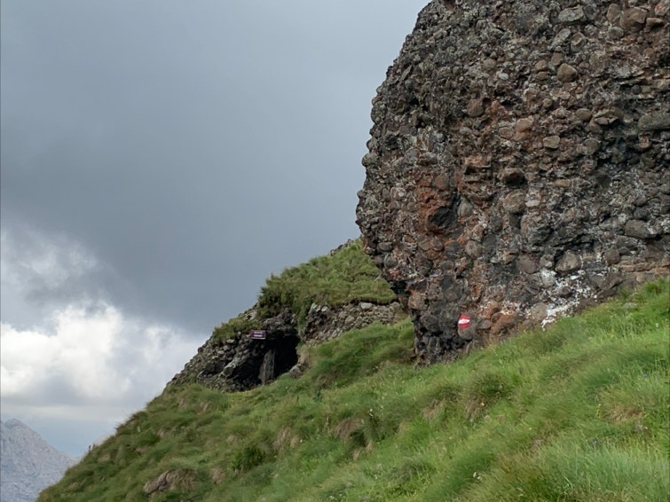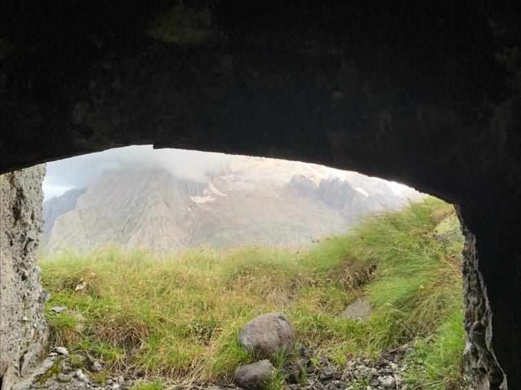Proseguendo lungo il sentiero, costantemente segnalato da cartelli indicatori si raggiunge la prima delle due postazioni di artiglieria, scavata nella roccia basaltica e rinforzata in calcestruzzo. In prossimità di questa opera in caverna, si apprezza una trincea scavata nella roccia con vista verso la Marmolada