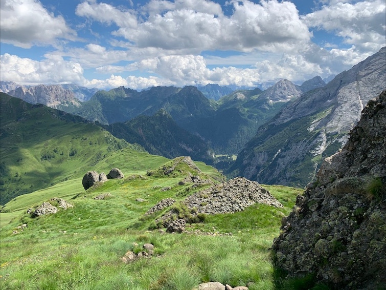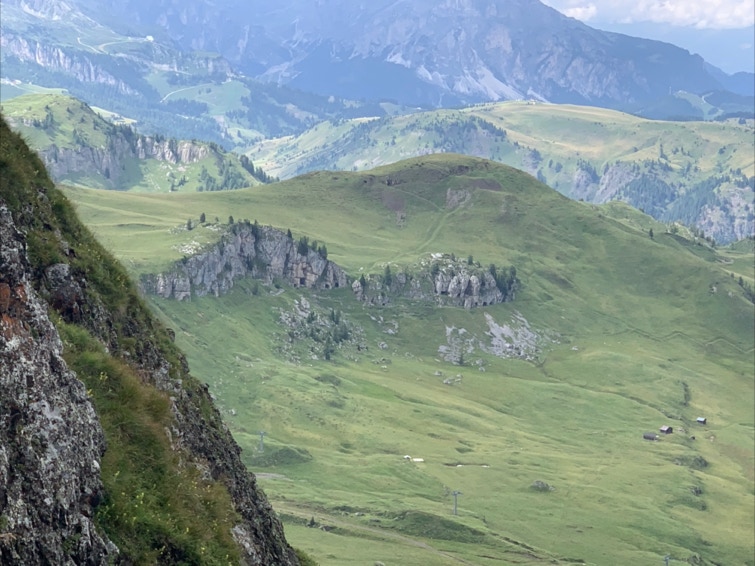 Da Ciamp de lo Stanzon si prosegue lungo la pista da sci fino ad incontrare, poco prima di arrivare al Rifugio Padon, una deviazione sulla destra chesegue il percorso della strada militare verso il Pianoro di Agnerezze e le Crepe Rosse.