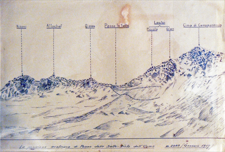 La prima linea di difesa austriaca posta a sbarramento della Valle San Pellegrino e, quindi, della Valle di Fassa, partiva da Cima Bocche, attraversava la valle a Fango e raggiungeva il sovrastante Passo de le Selle.