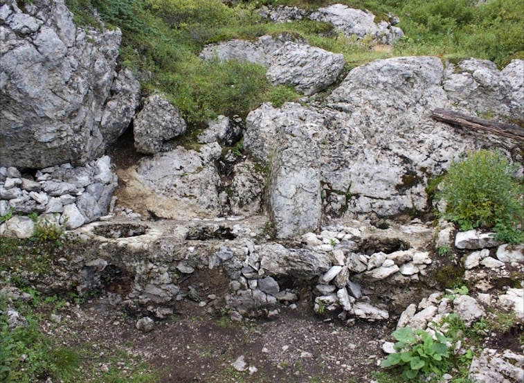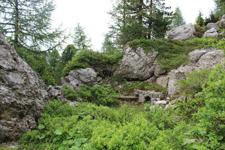 Si risale tra pini mughi fino a raggiungere un terrapieno che protegge una postazione con resti di una cucina da campo in discreto stato di conservazione.