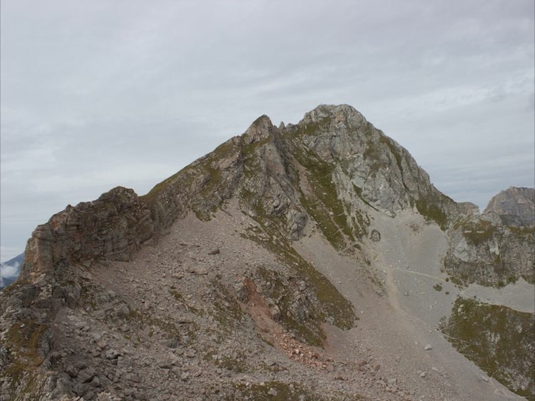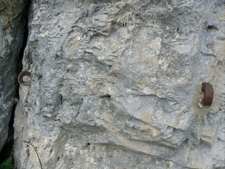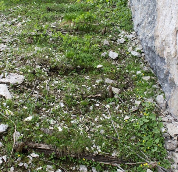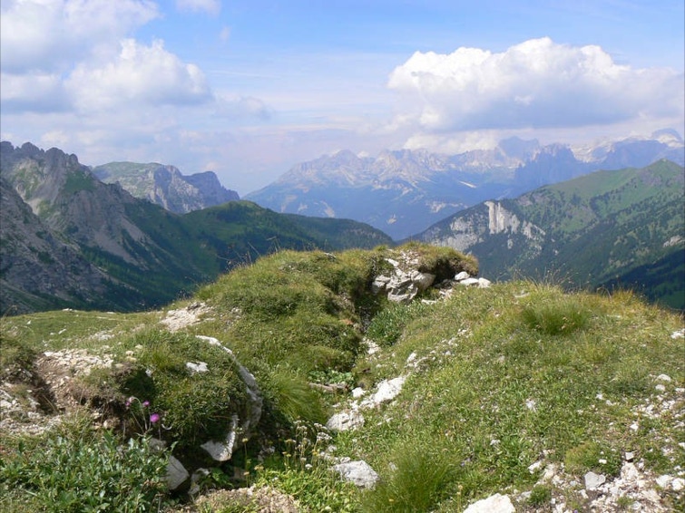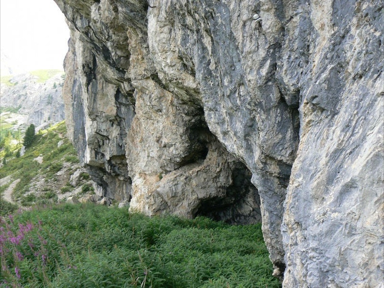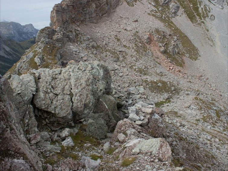 Seguendo sulla sinistra tracce di sentiero si supera la balza erbosa e se ne raggiunge la cima fino ad entrare in una stretta trincea di cresta con opere in caverna.