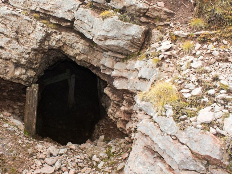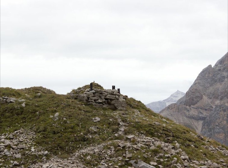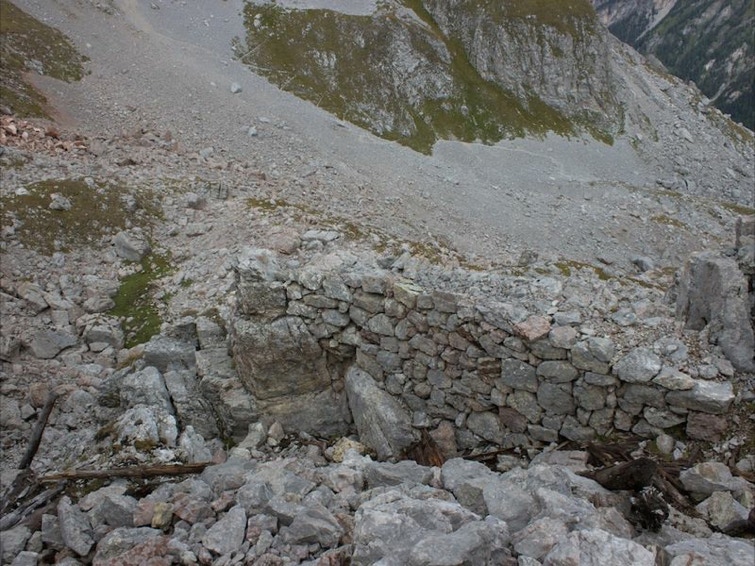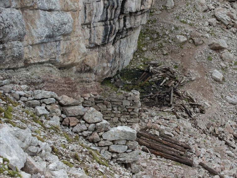 Tornando brevemente indietro si discende, quindi, per tracce di sentiero raggiungendo numerose opere austriache in caverna alla base della via normale per il Col Ombert.