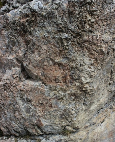 La si percorre in discesa con grande cautela fino ad un esposto terrazzamento: su una delle pareti interessante iscrizione.