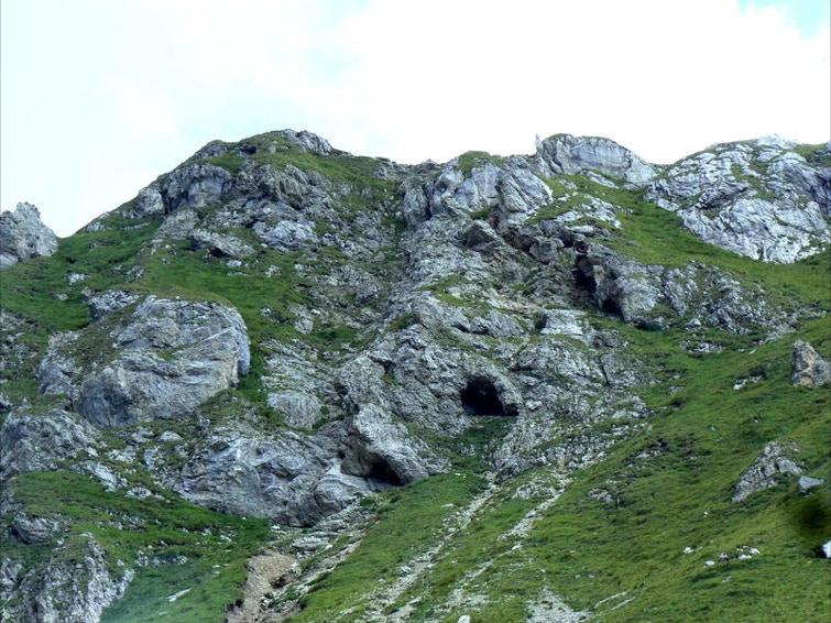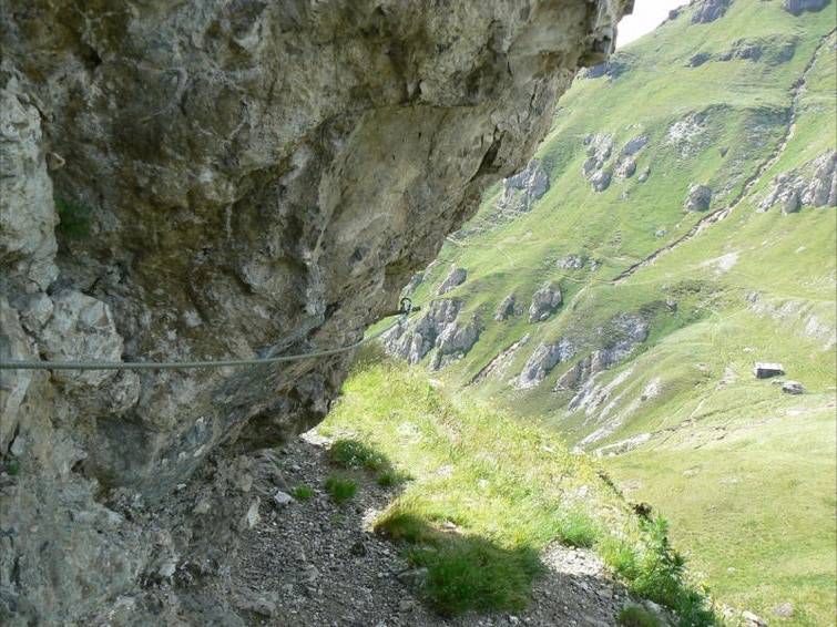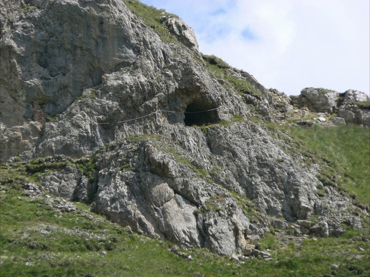 Si sale per tracce di sentiero o tagliando per il pendio erboso fino a raggiungere una stretta cengia a ridosso di basamenti di baracche e ricoveri in caverna. Una fune metallica aiuta l’attraversamento in un passaggio più esposto.