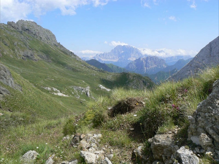 Dal Rifugio Marmolada (Passo Fedaia, m 2044) si imbocca il sentiero 698 che, ripido, si inerpica in direzione di Porta Vescovo.