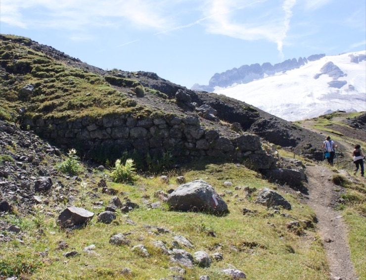 Una mulattiera risaliva dalla conca del Fedaia verso Porta Vescovo, assicurando i collegamenti tra le diverse postaziioni, riparata dal tiro avversario dal risalto basaltico rappresentato dal crestone di Pescul.