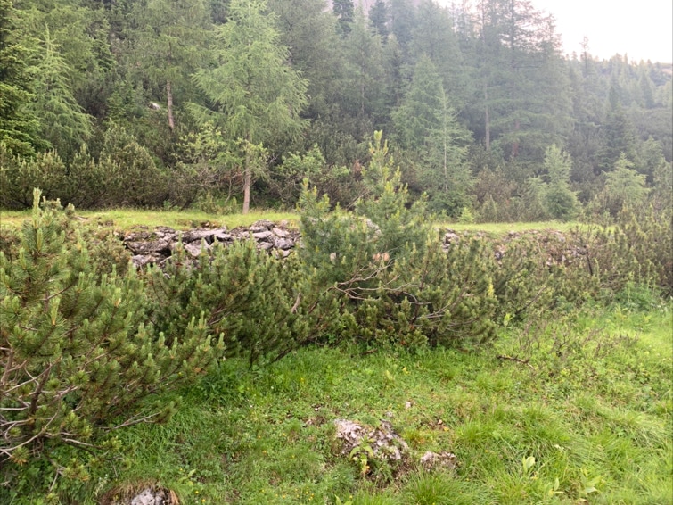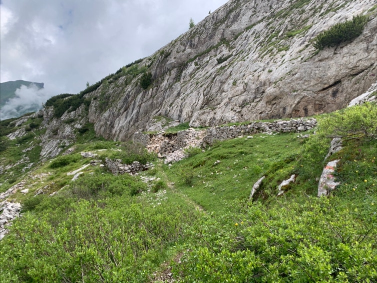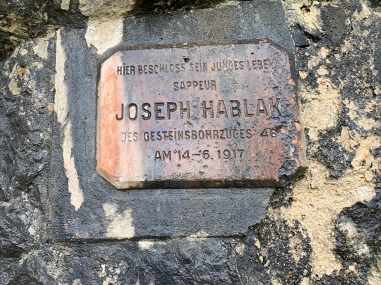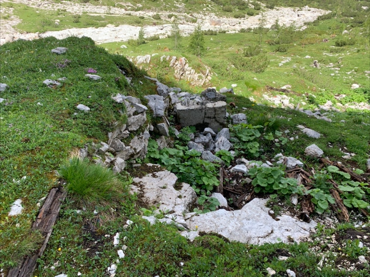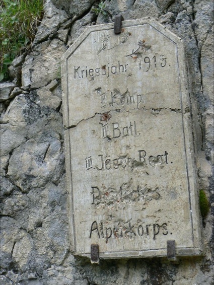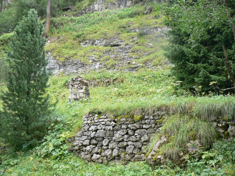 La costruzione della diga ha cancellato i resti delle numerose postazioni di questa zona del fronte. Poco prima di raggiungere la diga, sulle rocce sovrastanti il sentiero si trovano alcune tabelle commemorative a ricordo dei reparti austriaci e tedeschi che presidiavano questo settore. Abbandonando con cautela il sentiero in corrispondenza delle tabelle si apprezzano in basso i terrazzamenti con muri a secco di contenimento che costituivano i basamenti per le baracche delle immediate retrovie. In tale zona, denominata “Pozes”, parzialmente mascherate dalla vegetazione, si trovano altre due targhe, una delle quali dedicata alla Compagnia di Elettricisti.