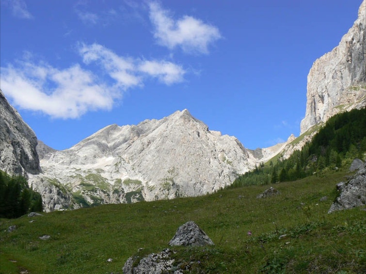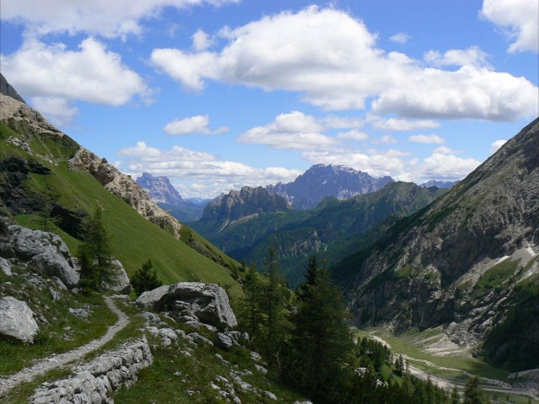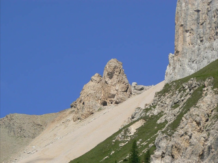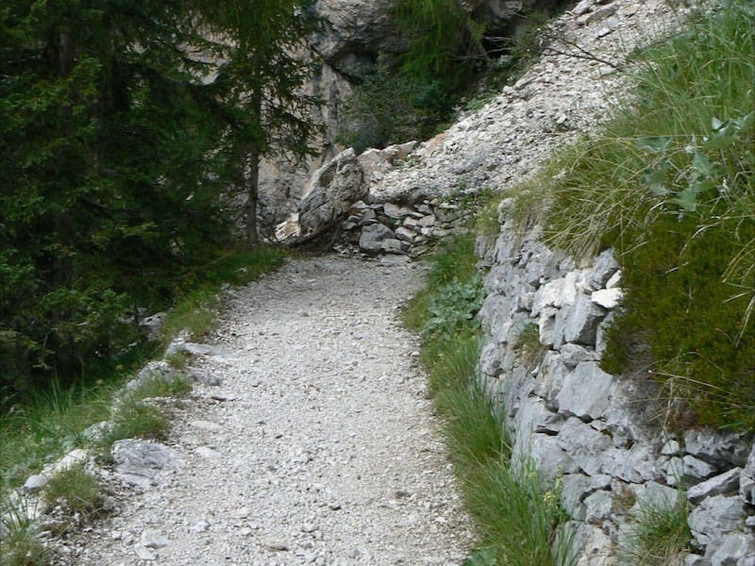 Seguendo larghi tornanti si perviene ad un bivio; si imbocca la larga mulattiera sulla destra che conduce all’imbocco della Val Ombretta ai piedi della parete sud della Marmolada.