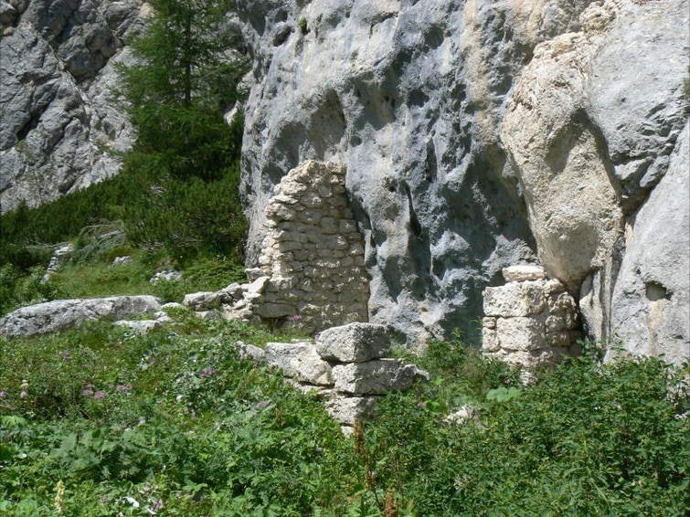 Qui la mulattiera termina e si continua su un sentiero ben visibile fino a raggiungere le casere della Malga Ombretta (1904 m): da qui doveva partire l’assalto con il pallone aerostatico alle postazioni austriache della forcella V.