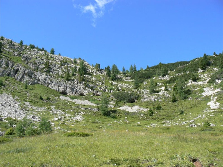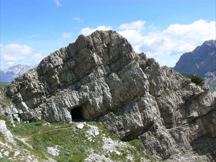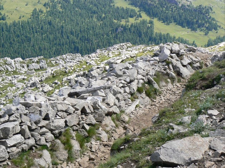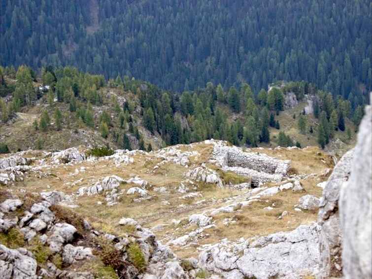 Si segue il sentiero a destra, fiancheggiando resti di baraccamenti per l’alloggio di truppa fino ad imboccare la ripida mulattiera di guerra italiana che costeggia alcune caverne e nicchie (“Stoli” in dialetto locale) scavate nella roccia con lo scopo di ospitare uomini, munizioni e rifornimenti al riparo dei colpi dell’artiglieria avversaria.