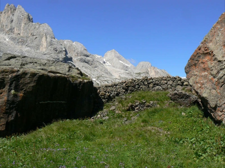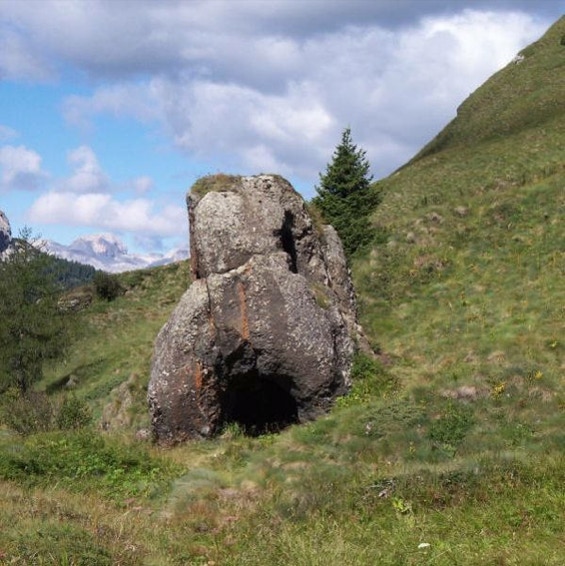 Si procede nell’erba alta per tracce di sentiero e si raggiunge un masso basaltico dalla forma squadrata, nel quale era stato ricavato l’osservatorio con vista sul passo sottostante e sul versante sud della Marmolada.