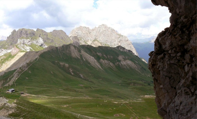 Sulla destra si erige la severa mole del Col Ombert, le cui pendici possono essere raggiunte seguendo le indicazioni per la via ferrata omonima.