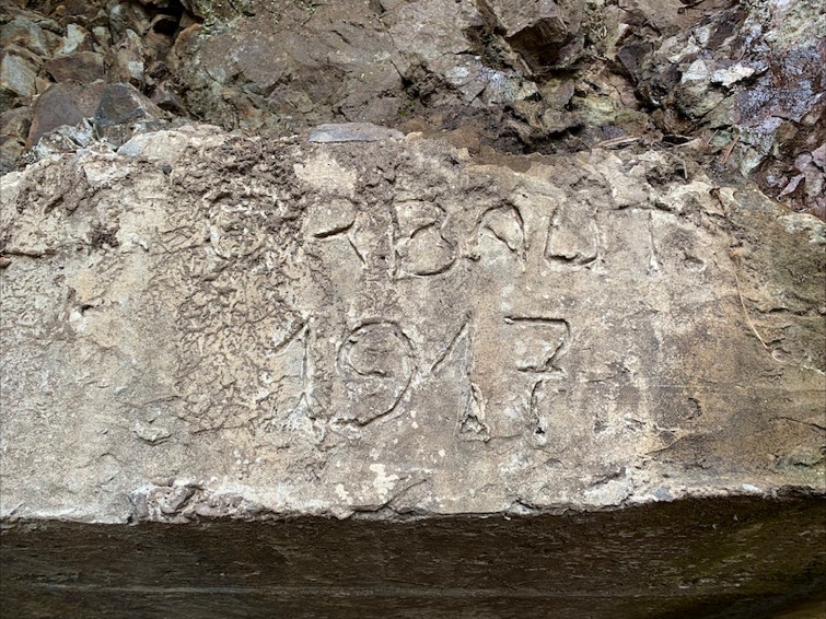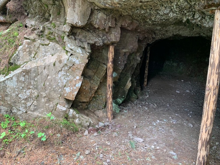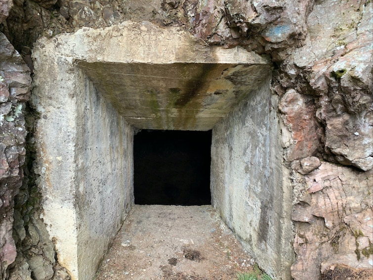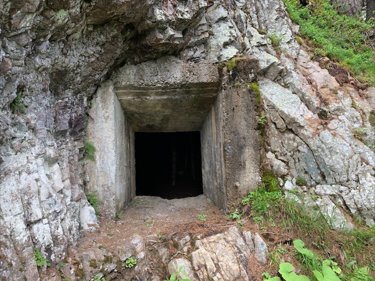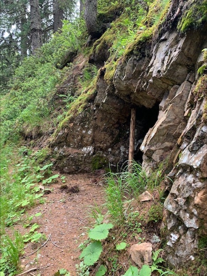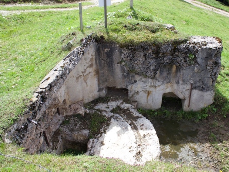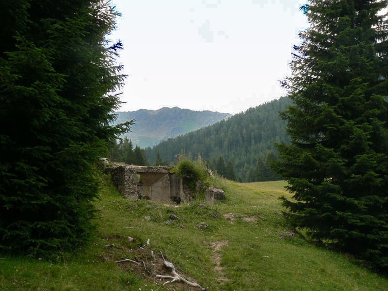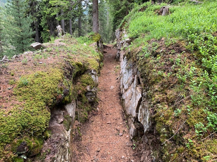 Una trincea conduce alle postazioni campali in caverna con le feritoie rivolte verso il Passo San Pellegrino. Sull’architrave di un’apertura si legge “erbaut 1917” (costruito nel 1917).