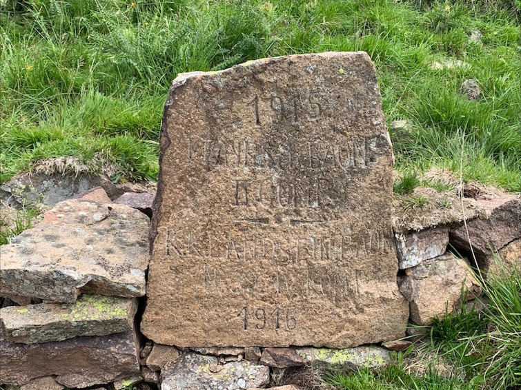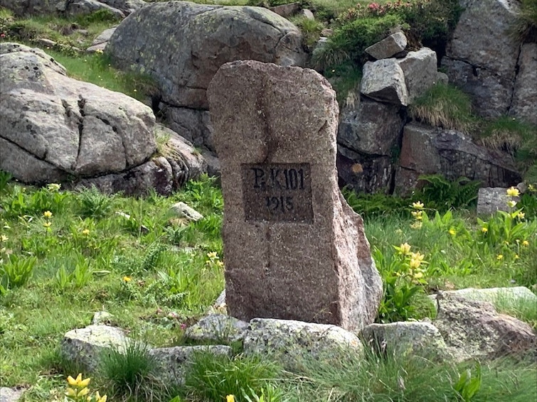 Il cammino prosegue con pendenza un po’ più accentuata, seguendo un lungo tratto di strada selciata munita ancora di paracarri che si mantiene ancora in ottime condizioni; si affrontano un paio di tornanti superato uno dei quali si trova sulla destra un cippo in porfido con una iscrizione della 101ma Compagnia Pionieri del Deutsche Alpenkorps che aveva realizzato l’opera.