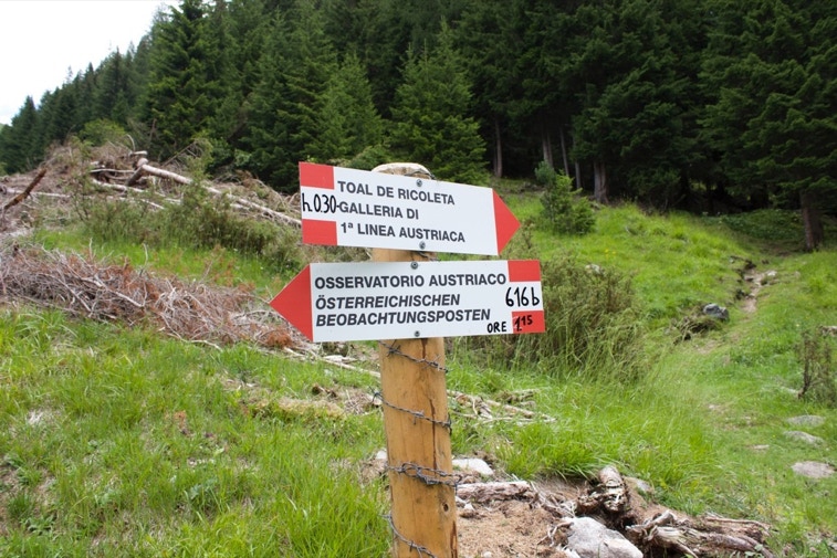 Dal campo trincerato “B” di Fango si segue il segnavia 616B per il sentiero attrezzato “Federspiel” fino a raggiungere un bivio con un cartello di segnalazione.