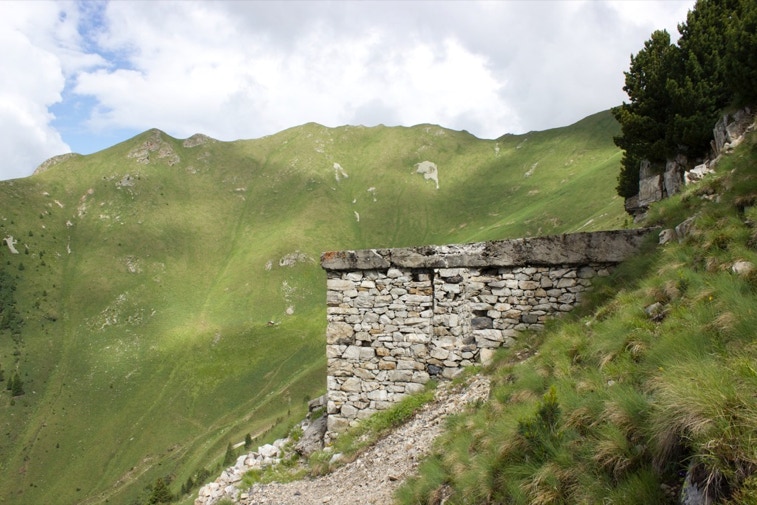Si prosegue lungo la mulattiera che risale la china erbosa e si attraversa il Toal de Masson fino a giungere all’osservatorio che sovrasta le postazioni di difesa di Fango.