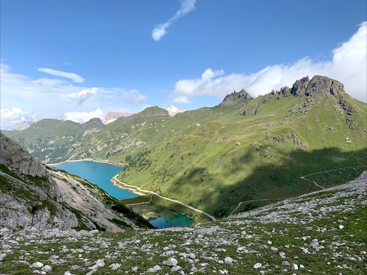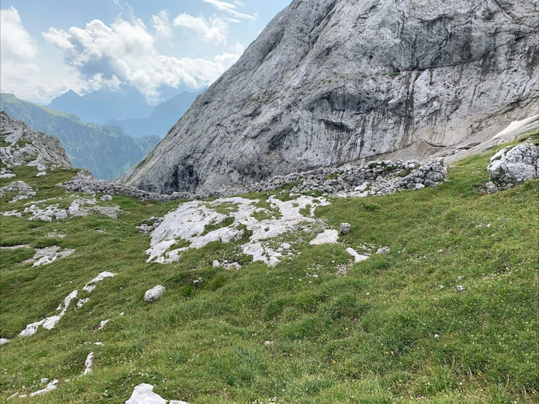 ITINERARIO ALTERNATIVO: risalire dal Passo Fedaia la pista da sci fino a trovare, sulla sinistra, dopo un paio di tornanti le indicazioni per la via Ferrata Eterna. Si risale il pendio per tracce di sentiero, seguendo i segnavia e gli ometti in pietra, fimo a raggiungere le prime tracce dei reticolati italiani e l’imbocco delle trincee.