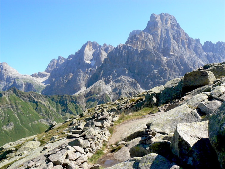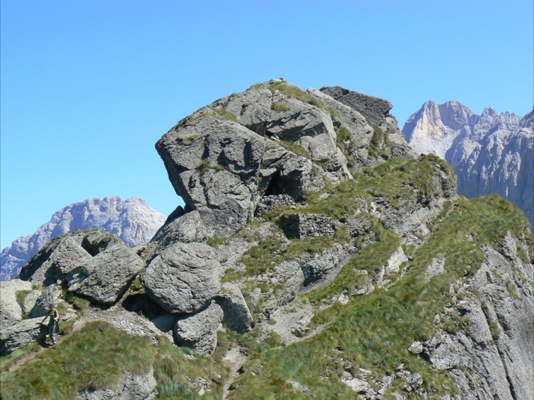 Si procede ora verso sud verso la Piccola Cavallazza, per sentiero più marcato e comodo, ma con tratti in forte esposizione sulla sottostante Valle di Primiero, con splendida vista sul gruppo delle Pale.