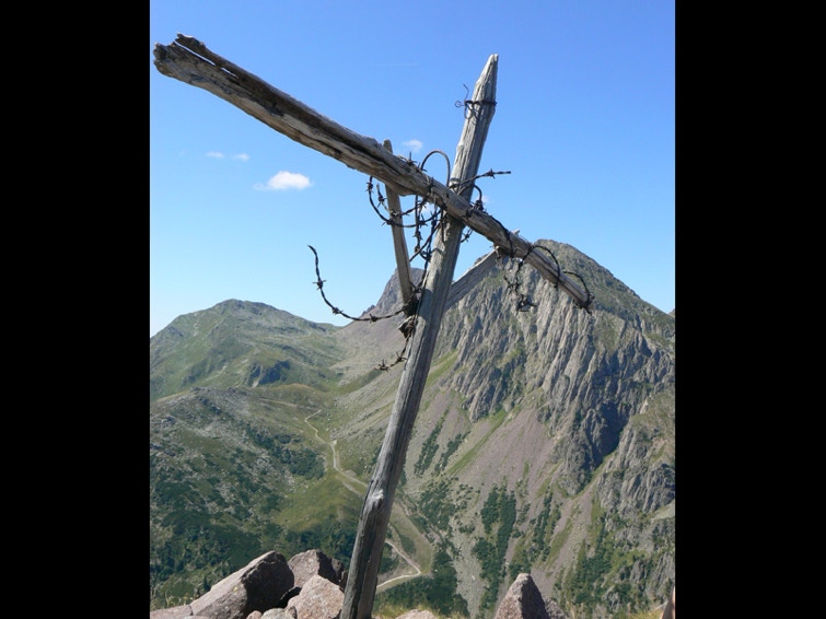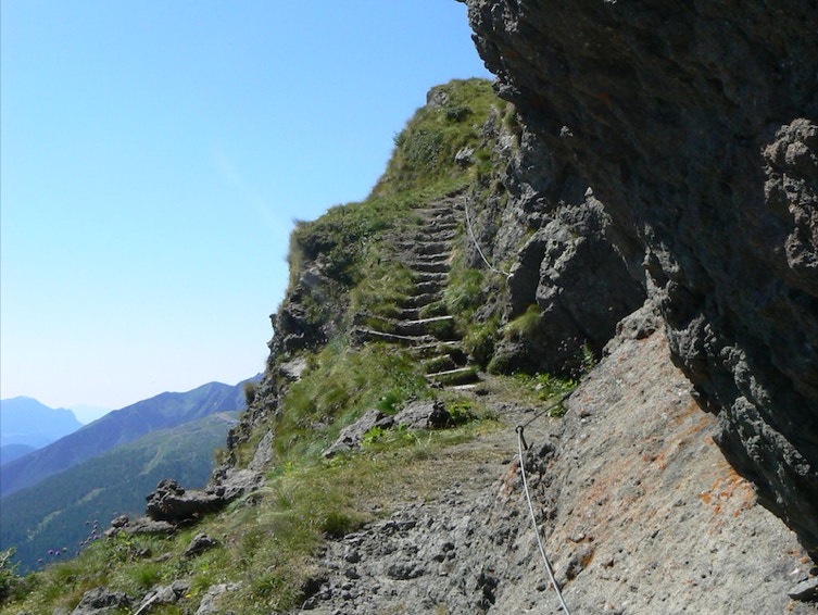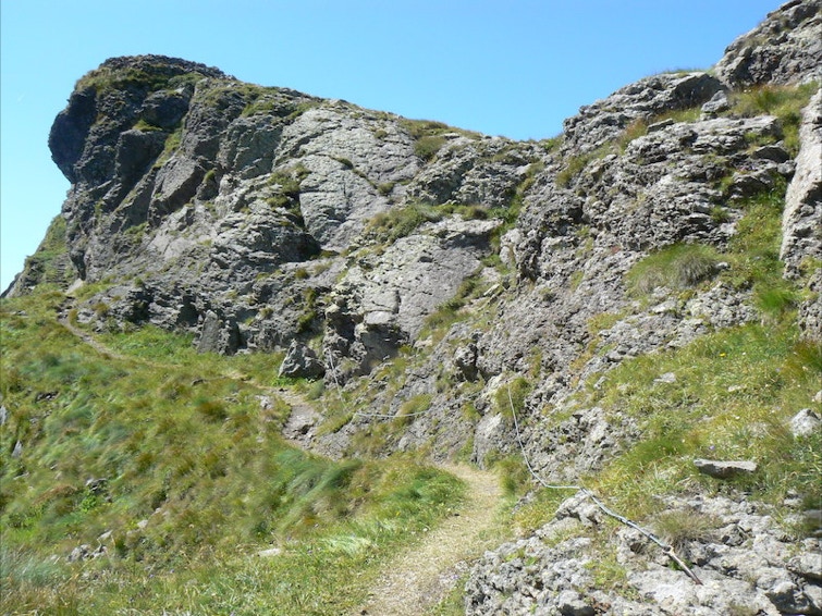 La cima della Piccola Cavallazza si raggiunge seguendo una fune metallica che permette di superare un breve passaggio esposto.