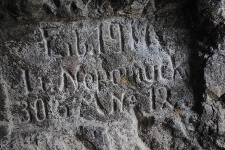 Recentemente, l’amico Aldo Albrizzi, che collabora al Sito e conduce ricerche su questo settore del Fronte, mi ha segnalato il ritrovamento di un’iscrizione nella caverna superiore che fa riferimento all’anno 1917, al Tenente Nepomuck e alla 30.5 cm Mörser Batterie Nr. 12 (tale numerazione differisce, stranamente, da quella riportata su un manifesto celebrativo) conservato presso il Museo della Grande Guerra di Passo Fedaia.