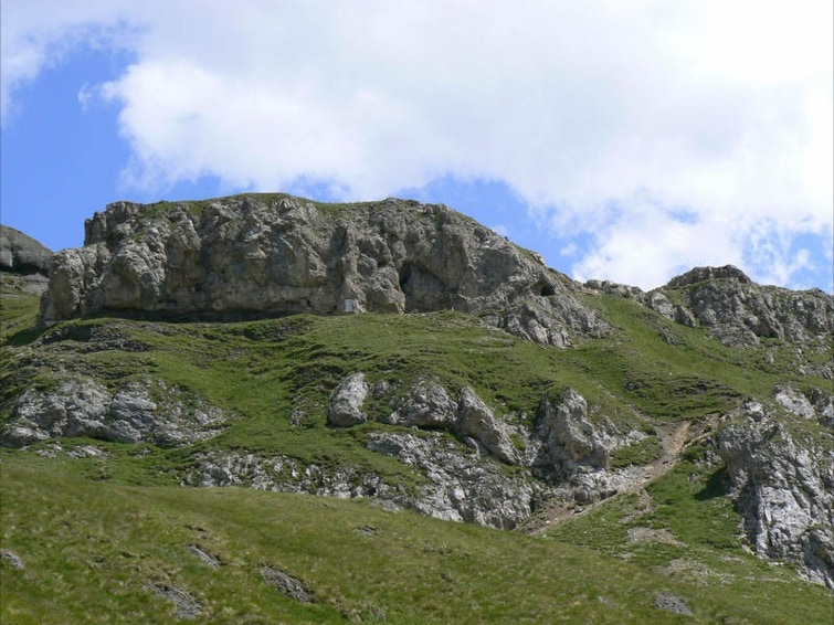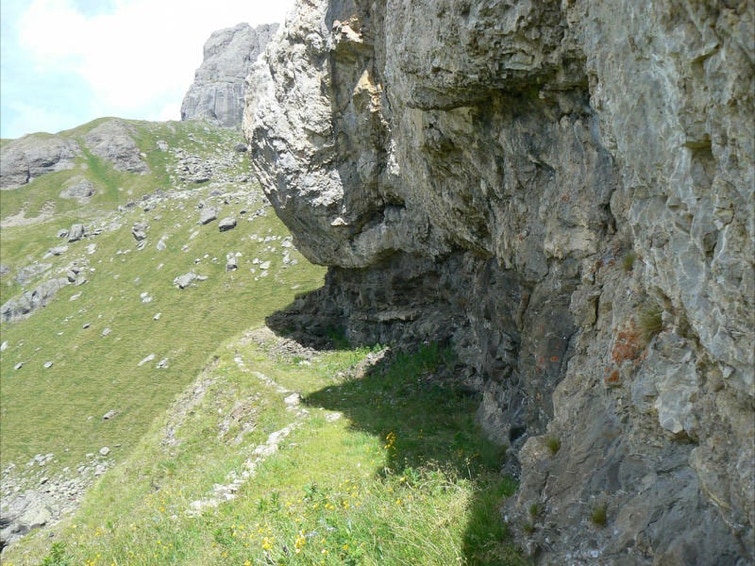 Si sale per tracce di sentiero o tagliando per il pendio erboso fino a raggiungere una stretta cengia a ridosso di basamenti di baracche e ricoveri in caverna. Una fune metallica aiuta l’attraversamento in un passaggio più esposto.