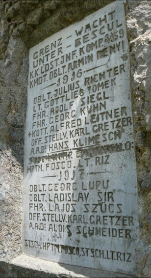 Una targa murata nella roccia ricorda i differenti reparti che si avvicendarono sulle postazioni ed i loro comandanti: da notare che è stata scalpellata via la Standschützen Kompanie Campitello.