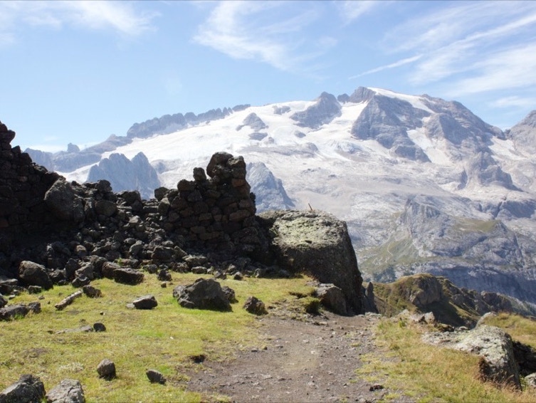 Una mulattiera risaliva dalla conca del Fedaia verso Porta Vescovo, assicurando i collegamenti tra le diverse postaziioni, riparata dal tiro avversario dal risalto basaltico rappresentato dal crestone di Pescul.
