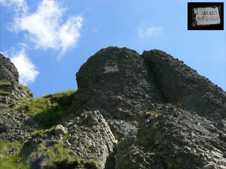 Deviando dal sentiero e risalendo con cautela per le tracce franate del vecchio sentiero militare si raggiunge una postazione di artiglieria austriaca (9 cm Kan. Batt. Oblt. Köhler). In alto si osservano ancora i segni della targa commemorativa riportata da Schaumann nella sua guida e ora, purtroppo, irrimediabilmente asportata da ignoti.