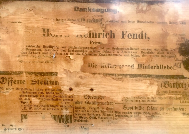 Sulle pareti di uno dei tabià (fienili), in una bacheca, sono conservati ritagli di giornali datati 16 giugno 1916 ritrovati all’interno dell’edificio che era sede del comando delle truppe austro-ungariche
