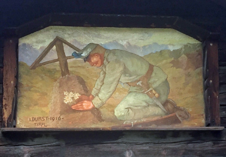 Sopra il cancello d’ingresso, contrassegnato dalla sigla 179J (Jäger) ad indicare la 179ª brigata di fanteria di stanza a Vigo di Fassa, un dipinto del pittore Josef Durst (1878-1950) raffigura un soldato sulla tomba di un commilitone.