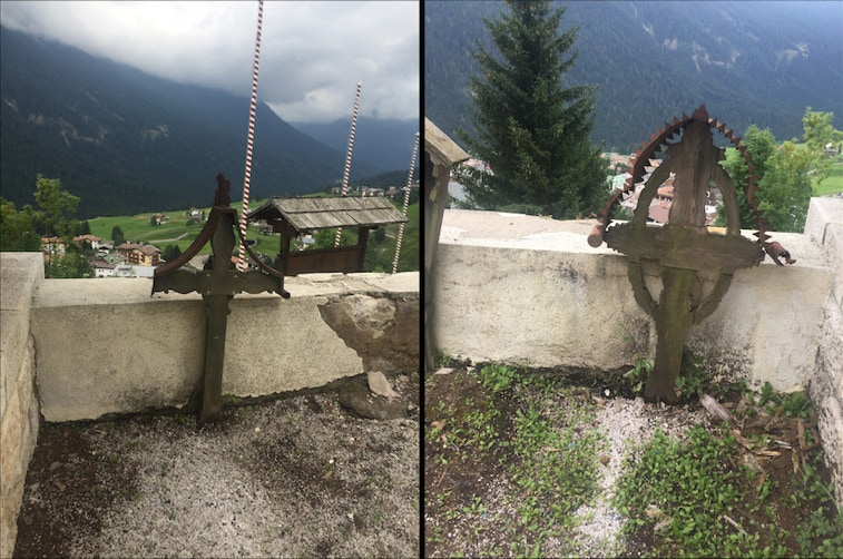 Le croci originarie in legno, realizzate e decorate dall’artista fassano Franzeleto Bernard (1875-1948), deterioratesi col tempo, furono sostituite durante i lavori di risistemazione eseguiti nei primi anni novanta; alcune di esse resistono al tempo appoggiate al muro di cinta del cimitero e sarebbero meritevoli di un restauro.